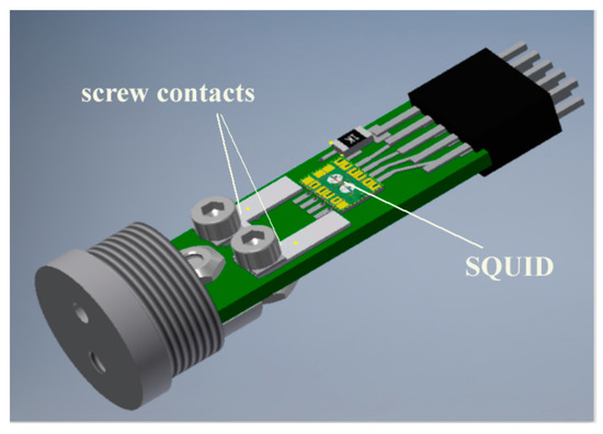 The SQUID was fixed using vacuum grease on a sapphire rod together with the modulation coil and the low temperature part of the flux antenna (see Figure 7a) in the vacuum part of the cryostat. The sapphire rod was cooled using liquid nitrogen through the inner wall of the fiberglass cryostat. The cryostat contains ~0.8 L of liquid nitrogen when it is completely filled and provides 2 days of SQUID operation at a temperature of ~78 K. The room temperature parts of the flux antenna were vacuum-sealed using epoxy in the outer wall of the cryostat and connected to their cooled counterparts (see Figure 7b). Commercial ac-bias electronics was used for SQUID operation in flux-locked loop mode (Cryoton Co. Ltd., Moscow, Russia).