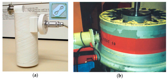 (a) Liquid nitrogen minicryostat used for the operation of a high-Tc DC SQUID gradiometer in an NDE system. The inset shows a photograph of the directly coupled high-Tc DC SQUID first order planar gradiometer, which was produced on a 1 cm2 LAO substrate and installed in the cryostat; (b) Scan of an airplane wheel rim using the high-Tc DC SQUID gradiometer system. The robotic arm scanner moves the cryostat along the outer surface of the wheel rim, while the wheel is rotated around its axis.