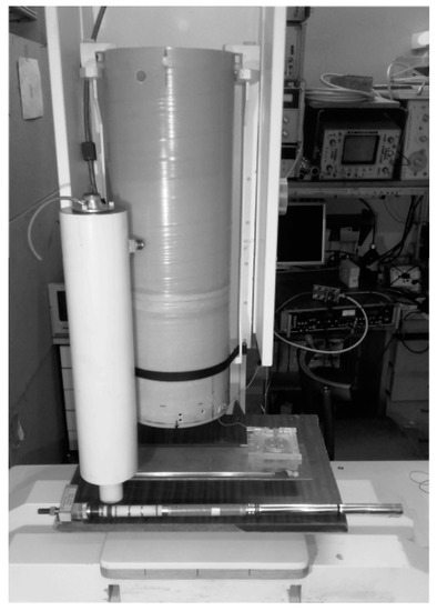 The single-channel low-Tc NDE system includes a liquid He cryostat, as shown in Figure 5. The inner diameter of the neck and inner tail of the cryostat is 22 mm. The distance between the outer and inner surfaces in the tail in the cooled system is no greater than 10 mm. The working time of the cryostat, which is cooled by 1.2 L of liquid He, is more than 2 days. The parameters of the liquid helium cryostat are as follows: outer diameter 110 mm; length 500 mm; outer diameter of the tail 45 mm; outer length of the tail 85 mm; inner diameter of the neck 22 mm; inner diameter of the cryogenic volume 80 mm; weight of the empty cryostat 2.2 kg. As the cryostat volume is relatively small, the filling procedure is relatively simple and takes several minutes. The small volume of He and the presence of a relief valve result in safety of the cryostat if the vacuum conditions in the space between the inner and outer walls are violated.