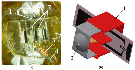 (a) Photograph of a high-Tc DC SQUID (1) assembled on a sapphire rod, showing parts of the magnetic flux antenna (2) and the modulation coil (3) on ferromagnetic wires (4); (b) Sketch of a DC SQUID with a directly coupled pick-up loop assembled together with low temperature (1) and room temperature (2) parts of the flux antenna.