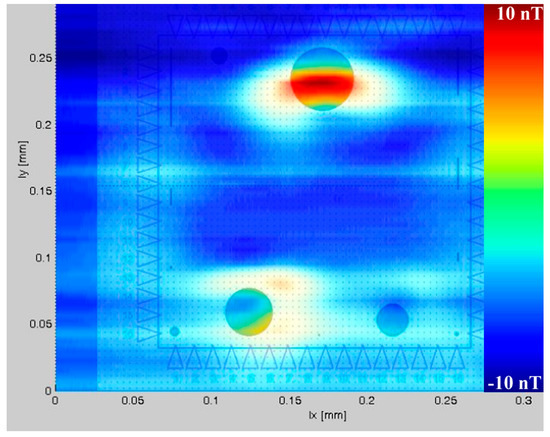This system was used to perform measurements of the magnetic field distribution over a US $1 bill, for a qualitative comparison of the device with SQUID microscope systems made by other groups [51,52]. The magnetic signal originates from the black ink used for printing banknotes, which contains a small quantity of magnetite (Fe3O4) nanoparticles. The measurements were nondestructive. Such a system can also be used for the detection of magnetic ink on old bills, which can result in false alarm signals in the detection of counterfeit notes using conventional magnetic ink testers.