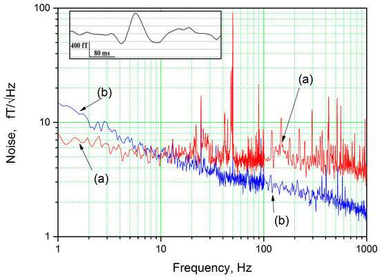 Noise spectra of a 20 mm high-Tc DC SQUID magnetometer measured at 77 K in a magnetic shield: (a) without a ferromagnetic antenna and (b) with a ferromagnetic antenna. The inset shows a measurement of human magnetoencephalography performed using a high-Tc DC SQUID magnetometer that has a sensitivity in the femto-Tesla range at low frequencies.