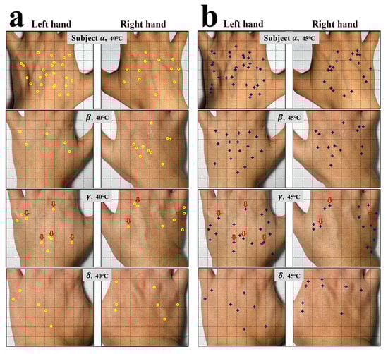 Photographs for the locations of sensory spots on the back of hands of subjects α, β, γ, and δ. (a) Yellow circles and (b) Blue crosses highlight the locations of sensory spots responded to at 40.0 and 45.0 °C, respectively. Red arrows in (a,b) are used to mark the locations of fixed sensory spots responded to at 40.0 and 45.0 °C.