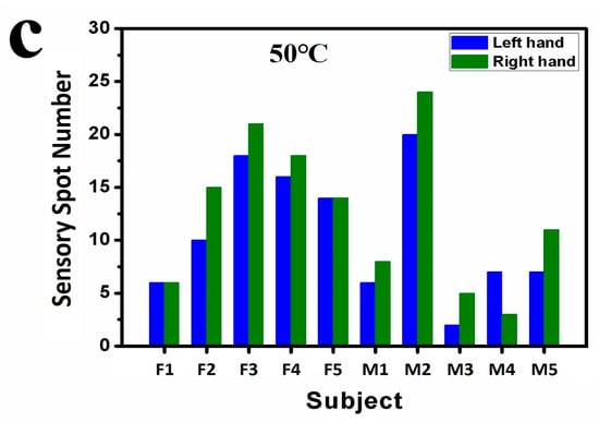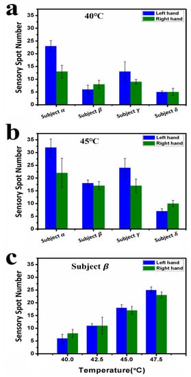 We have also found that the number of sensory spots increased with the testing temperature, as shown in Figure 2a,b, which plot the average testing results of the three same conditional measurements at 40.0 °C and 45.0 °C for all four subjects, respectively. The number of spots were not balanced between two hands. For 40.0 °C, subjects α and γ had more sensory spots on their left hand than the right, but subject β had more spots on her right hand than on the left, and subject δ had nearly equal number of spots on both hands. Figure 2c shows a typical result for subject β measured at 40.0, 42.5, 45.0, and 47.5 °C. The trend that the average numbers of sensory spots on both hands increase with the testing temperature can be clearly seen. Interestingly, only a small portion of the spots kept their locations when tested at varied temperatures. With increasing temperature, the newly measured sensory spots at higher temperatures often occurred at different locations. Comparing the distributions of sensory spots shown in Figure 1a,b, taking subject γ for an example, 5 of the 20 spots on his left hand and 4 of the 15 spots on his right hand at 45.0 °C (highlighted with red arrows) had the same locations with those measured at 40.0 °C.