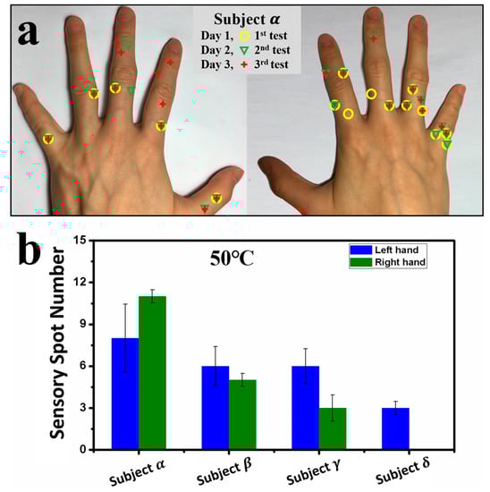 Results of locations and numbers of sensory spots on the backsides of the fingers of subjects α, β, γ, and δ. (a) Photographs for the locations of sensory spots responded to at 50.0 °C on the backsides of the fingers for subject α. Yellow circles highlight the first test result, green triangles highlight the second test result, and red crosses highlight the third test result; (b) Average numbers of sensory spots responded to at 50.0 °C on the backsides of fingers for the four subjects.