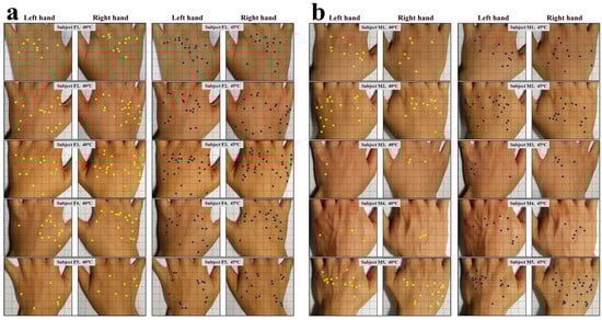 Figure 4 shows the locations of sensory spots on the back of the hands of the 10 subjects tested in the second round of experiments. In the left panel (Figure 3a), the locations of sensory spots of five female subjects for the probe tip temperature of 40.0 °C and 45.0 °C are highlighted, and in the right panel (Figure 3b), the locations of sensory spots of five male subjects at corresponding testing temperatures are marked. From this figure, the small numbers of sensory spots and irregular locations and asymmetric distribution between the left and right hands of the same subject were repeatedly observed. The male subjects M3 and M4 even had only 2–3 sensory spots at 40.0 °C. Yet it is not clear what factors determine the number of sensory spots for each person.