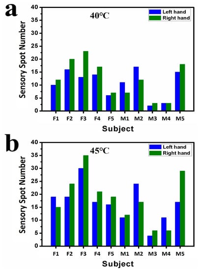 Figure 5 plots a statistics analysis of the testing results for the second round of experiments. All the five female subjects and left-handed male subjects M3 and M5 had more sensory spots on the right hands at 40.0 °C. Only right-handed male subjects M1 and M2 were found more sensory spots on their left hands. For 45.0 °C, subjects F2, F3, F4, F5, M1, M3, and M5 showed more sensory spots on their right hands, while subjects F1, M2, and M4 showed more sensory spots on their left hands. The trend that the number of sensory spots increases along with the testing temperature is obvious. For 50.0 °C, F2, F3, F4, M3, and M5 still had larger numbers of sensory spots on their right fingers and the largest number of sensory spots measured on the fingers in this round of experiments was 24, on the right fingers of subjects M2. From current data, no correlation was found between the locations of sensory spots and the habits of hand use.