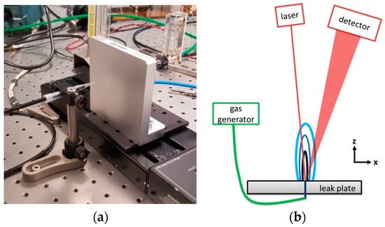(a) Leak plate mounted on a linear displacement stage. The tip of an extractive sampling probe is positioned at 10 mm distance in front of the plate; and (b) the schematic setup for standoff leak detection.