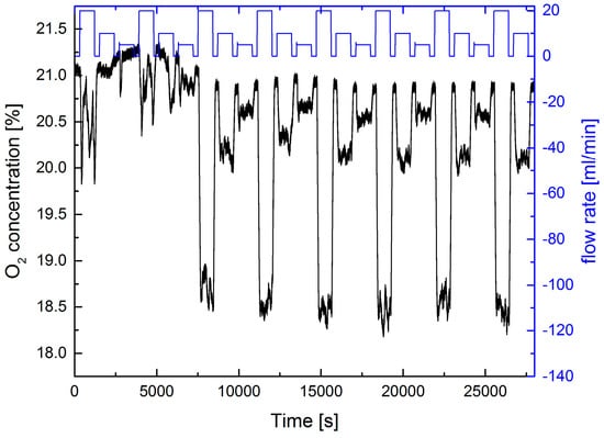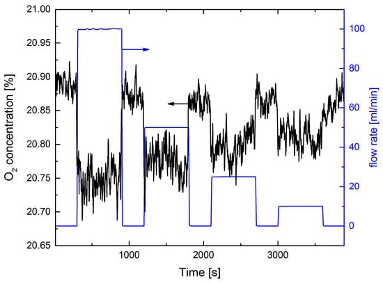 Extractive static measurement of the O2 concentration using a 0.5 mm diameter tip in a distance of 10 mm from the leak plate. A pump rate of 100 mL/min was employed. The upper blue curve shows the variation of the N2-flux from the leak plate vs. time (right ordinate axis). Flux steps of 20, 10, and 5 mL/min were used.