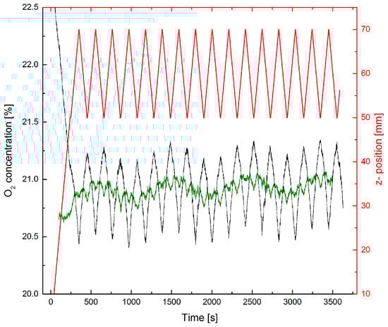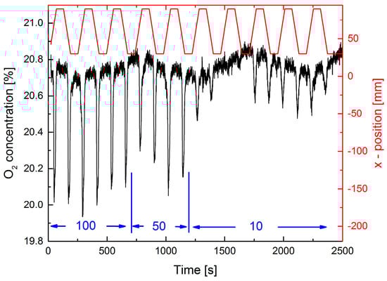 Extractive dynamic measurement of the O2 concentration using a 0.5 mm diameter tip at a distance of 10 mm from the leak plate. A pump rate of 500 mL/min is used. The upper red curve shows the position of the sliding stage which moves back and forth with 1 mm/s. The leak position is at 60 mm (right ordinate scale). Three different N2-fluxes of 100, 50, and 10 mL/min are applied as indicated in blue.