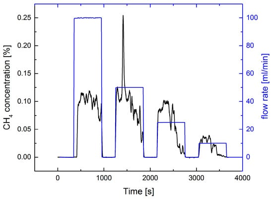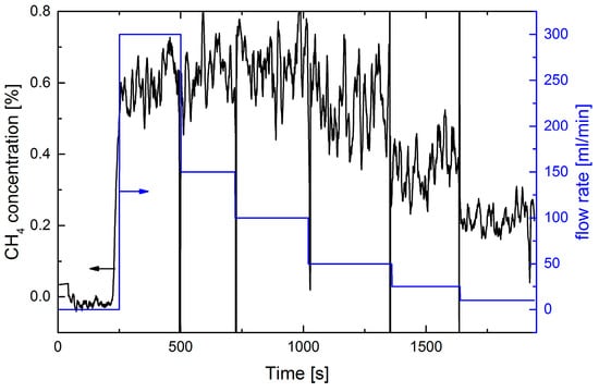 Extractive static measurement of the CH4 concentration using a 0.5 mm diameter tip at a distance of 10 mm from the leak plate. A pump rate of 100 mL/min was employed. The blue curve shows the variation of the gas flux from the leak plate vs. time (right ordinate axis). Flux steps of 100, 50, 25, and 10 mL/min were used.