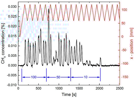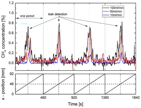 The dynamic CH4 measurement in Figure 5 is qualitatively similar to the results displayed in Figure 3. Due to the lower pump rate the gas exchange time in the measurement cell is longer than in Figure 3. Thus, strong fluctuations and missing peaks are observed. The concentration values are much smaller than in Figure 4 because the cell is only partly filled when the leak position passes the tip. For repetitive measurements detection of fluxes of 10 mL/min is feasible, but lower fluxes are hardly observable despite the high SNR. However, for 100% CH4, this result may be scaled to detectable leak rates in the range of 10−3 mbar·L/s.