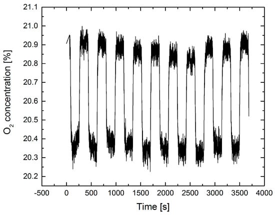 A further confirmation of the feasibility of the indirect method is obtained by the following experiment: a gas cell with 15 mm length and a diffuse reflecting backplate (DG10-120, Thorlabs Inc., Newton, NJ, USA) was inserted into the laser beam at the position of the leak plate in Figure 1b). Due to the small cell volume of ≈6.5 mL a rapid gas exchange is possible. Figure 7 shows the result of an experiment exchanging the air in the cell by N2. The observed reduction in total average O2 concentration for an optical path length of 114 cm agrees very well with the calculated of Δc = 20.9% × (3 cm/114 cm) = 0.55%.