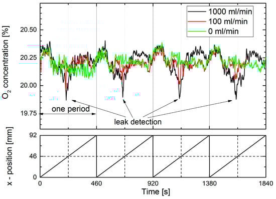 In Figure 3 a dynamic measurement is displayed. A scan speed of 1 mm/s for the sliding stage was chosen, which seems quite realistic for manual leak searching. In contrast to the static measurements the O2-concentration dips at the leak position show considerable fluctuations. For 10 mL/min some of the dips are completely missing. This has two reasons: First, the speed of the sliding stage is too fast for the extractive technique even at a pump rate of 500 mL/min. Thus, a complete exchange of the gas in the cell is not possible when the leak position is passing by in front of the probe tip. This behavior is an essential disadvantage of any extractive method. The other reason is that, for low rates, the flow is more likely deflected by any small air turbulence in the lab. However, for a repetitive measurement, detection of a leak with 10 mL/min, i.e., with a leak rate above 0.1 mbar·L/s, is feasible.