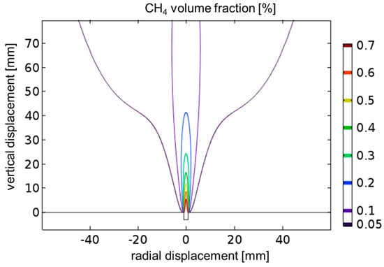 CFD simulation using COMSOL for a flux of 1% CH4 in N2 effusing from an orifice of 1 mm diameter with 100 mL/min into ambient air. An axial cut along the gas flow direction through the centrosymmetric laminar flow distribution shows iso-concentration lines of the CH4 volume fraction.
