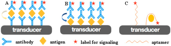 In order to develop a highly sensitive and specific immunosensor, a molecular recognition element (MRE) with a high affinity must firstly be immobilized onto the sensing interface. Specific antibodies/antigens [33,35] and aptamers [36] are two kinds of well-established MREs (Figure 1). The antigen–antibody reaction is the basis of immunoanalysis in clinical laboratories, and modern immuno-labeling techniques using highly sensitive substances as labels have further broadened the scope of immunological techniques. In recent years, oligonucleotide aptamers have exhibited high affinity and specificity, as well as high speed in selection, synthesis, and scale-up, which has attracted great attention in terms of diagnosis and therapeutics [37,38,39]. These specific MREs are firstly immobilized on the transducer’s surface as capture probes, and the target proteins can then be specifically recognized by capture probes, linking to the interface of biosensors. The recognition reaction may be accelerated by external driving forces, such as stirring and electricity [40]. The transducer converts the biological response generated by the interaction of specific recognition pairs into a measurable signal to the receptor [41].