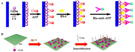 (A) Quantum dots (QDs) acted as biocompatible matrices for the immobilization of alpha fetoprotein (AFP) and photoactive materials to increase the photoelectrochemical (PEC) signals. (B) Chitosan-modified magnetic oxide graphene composite (CS@Fe3O4@GO) worked as supporting matrices for thrombin aptamer. Reproduced from [37,42] with permission from Elsevier.