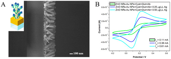 (A) SEM surface micrographs of ZnONR–AuNP nanohybrids from top view. Inset: Schematic model of a ZnONR–AuNP nanohybrid immunosensor for CA125 detection. (B) Cyclic voltammograms of ZnONR–AuNP-hybrid-modified electrodes immobilized with cystamine (Cyst), glutaraldehyde (Glut), Ab, and 0.25 or 0.50 μg μL−1 of CA125 antigen. Reproduced from [46] with permission from Elsevier.