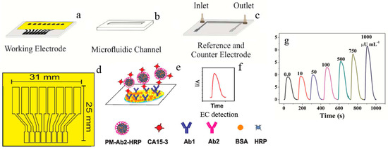 Construction of a disposable microfluidic immunoarray device: (a) working electrode; (b) microfluidic channel and (c) reference and counter electrodes; (d) pattern and size of the working electrode array; (e) the formation of the immunosandwich structure; (f) EC detection strategy; (g) amperometric responses of CA15–3 standard solutions at −0.2 V vs. Ag/AgCl after the injection of a mixture of H2O2 and HQ. Reproduced from [23] with permission from the American Chemical Society.