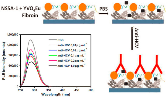 Schematic representation and PL spectra of the as-prepared biosensor. The LbL film of SF/NS5A-1+YVO4:Eu3+ NPs showed specific recognition in the presence of anti-HCV antibodies. PL spectra obtained for the LbL film containing five bilayers of fibroin/NS5A-1+YVO4:Eu3 NPs in the presence of different concentrations of anti-HCV. Reproduced from [33] with permission from Elsevier.