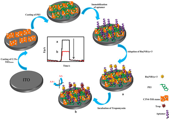 Semiconductors have been widely used in PEC immunosensors, exhibiting a high detection sensitivity and an LOD at the pg mL−1 level when combined with proper signal amplification strategies. Zhang et al. [51] reported a PEC immunosensor based on Mn-doped CdS (CdS:Mn QDs) on graphitic carbon nitride (g-C3N4) nanosheets as a photoactive material for the sensitive detection of a prostate-specific antigen. The signal was amplified through DNAzyme concatamers on AuNPs accompanying enzymatic biocatalytic precipitation, showing an LOD as low as 3.8 pg mL−1. These nanohybrids highly improved sensing sensitivity and showed results comparable to those attained via ELISA methods. A visible-light-driven PEC method for the detection of shrimp allergen tropomyosin was constructed using g-C3N4 and TiO2 as photoactive nanomaterials [38]. Ascorbic acid worked as an electron donor, and Ru(NH3)63+ was adsorbed on the specific aptamer to enhance the photocurrent signal (Figure 6). After recognition between tropomyosin and the capture aptamers was established, the absorbed Ru(NH3)63+ were released from aptamers and prevented the electron donor from scavenging photogenerated holes to the photoactive-material-modified electrode, based on which the quantitative detection of the target obtained a concentration range of 1~400 ng mL−1, with an LOD of 0.23 ng mL−1. This sensing process could be performed in the absence of antibodies and enzymes, overcoming the drawbacks of the clinically used ELISA method for tropomyosin detection. A p-type semiconductor, p-CuBi2O4, was used as a photocathode with hemin as the photocurrent enhancer to design a split-type PEC immunosensor for AFP detection [54], where AuNPs were immobilized on the fluorine-doped tin oxide electrode as a front contact of p-CuBi2O4 to enhance the efficiency of charge separation. The hemin-based G-quadruplex was labeled on the AuNP and acted as the signal probe, showing a wide linear dynamic range from 50 pg mL−1 to 20 ng mL−1, with an LOD of 14.7 pg mL−1. Neto et al. [55] reported a PEC platform for the immunodiagnosis of canine leishmaniasis using two kinds of peptides from two different proteins, and high specificity and selectivity toward the recognition of L. infantum antibodies were demonstrated. The sensing platform was firstly constructed by a double-layer electrodeposition of ZnO and CdS QDs, providing a more sensitized photocurrent response. The immunosensor was able to discriminate between positive and negative canine serum samples at low cost. Recently, a PEC immunosensor based on CdAgTe QDs and dodecahedral AuNPs, stabilized by ionic liquid, was fabricated for the specific detection of cTnI [56]. Under the enhancement of AuNPs, the photocurrent showed a more than 10-fold amplification. The relative photocurrent variation upon the formation of the antibody–antigen complex was used for quantitative detection. The PEC immunosensor showed a relative photocurrent variation directly proportional to the logarithm of cTnI concentration between 5.0 pg mL−1 and 20.0 ng mL−1, with an LOD of 1.756 pg mL−1. Ge et al. [58] proposed an interesting PEC technique using CL as the internal light source for a sandwich immunoassay of CA 125. Hybrids of N-aminobutyl-N-ethylisoluminol, HRP, and CA 125 antibodies were immobilized on graphene oxide and showed excellent CL activity. The ZnONRs grew on a reduced-graphene-oxide-modified paper working electrode with the deposition of CdS QDs, resulting in an enhanced excitation and photo-to-electric conversion efficiency. The immunosensor exhibited a linear range from 5.0 × 10−4 to 500 U mL−1, with an LOD of 2.0 × 10−4 U mL−1.