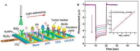 As is well known, many cancers show more than one tumor marker overexpressed in the serum of a patient, so the simultaneous and accurate testing of multiple tumor markers may improve the diagnosis of certain types of tumors. A light addressing strategy-based label-free PEC sensing platform was designed for multiple tumor marker detection at the same time on a single electrode [59] (Figure 7). Uniform photovoltaic material Bi2S3 with a high conversion efficiency in visible light ranges was firstly modified on an ITO electrode by a novel two-step constant potential deposition method. By immobilization of three specific antibodies on the sensor interface, the PEC immunosensor achieved rapid and sensitive simultaneous detection for AFP, carcinoembryonic antigen (CEA), and cancer antigen 19-9 (CA19-9), showing very similar analytical performances, with calibration ranges of 0.01~100 ng mL−1 for CEA and AFP and 0.1~1000 U mL−1 for CA19-9.