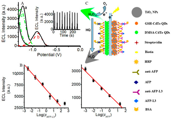 (A) ECL curves of simultaneous scan of DMSA-CdTe QDs and TiO2-GSH-CdTe QD composites; individual scan of (a) DMSA-CdTe QDs, (b) TiO2-GSH-CdTe QD composites, and (c) modified ITO electrodes. Inset: Continuous cyclic simultaneous scans of DMSA-CdTe QDs and TiO2-GSH-CdTe QD composites modified ITO electrodes. (B) Linear calibration plots for detection of AFP-L3 (left) and AFP (right). (C) Sandwich immuno-structure of HRP-labeled antibody–antigen biotinylated antibody on the immunosensor and detection procedures of analytes (green arrow: luminescence; gray arrow: quenching). Reproduced from [66] with permission from the American Chemical Society.