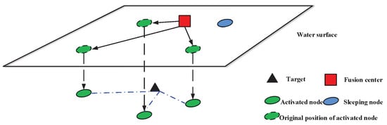 Network model (the black triangle is a moving target; the red square is the fusion center; the blue oval is the sleeping node, which is static at the water surface; the green ovals are activated nodes, which move down vertically for sensing the target according to commands from the fusion center).