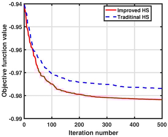 Furthermore, the searching performance of our improved HS algorithm is presented in Figure 5. We use the convergence process of objective function value to show the searching performance of the optimization method. In addition, the convergence process of traditional HS algorithms is presented as a comparison. In this simulation, we show the 500 iterations’ convergence process of objective function value via two methods at the same time interval , and the results are the averaged value after 100 Monte Carlo simulations.