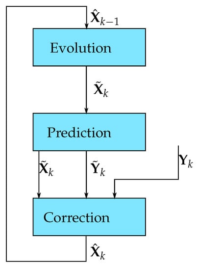 As exposed earlier, Kalman filters rely on the state representation of a system. They are specialized Bayesian estimators for linear systems with discrete time and Gaussian noises. To do the estimation, the Kalman filter updates Equations (3) and (4) to Equations (5) and (6), where and are state and measurement noise vectors.