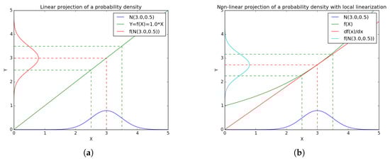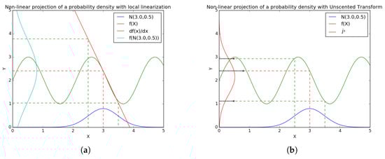 The Unscented Transform (Appendix A) replaces the approximated linear projection of the Gaussian noise through the linear function by the projection of weighted points, n being the size of the state vector, through the non-linear function. The mean and standard deviation of the weighted projected points is then computed to approximate the new, more precise, Gaussian density function at the output [,,].