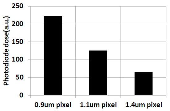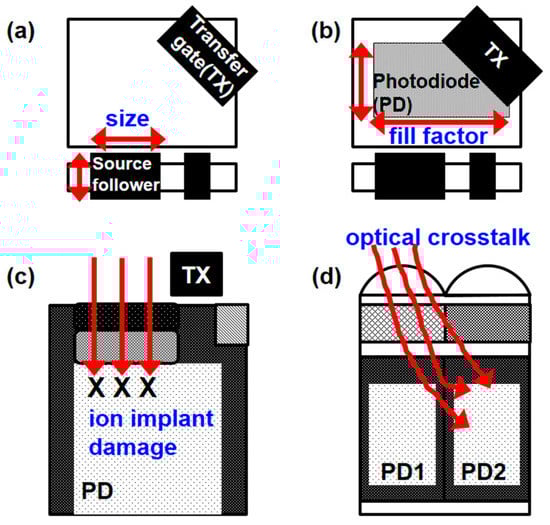 However, sensor performances of the small pixel are generally inferior to those of previous generations with larger pixel sizes []. Major challenges in submicron pixel generation are shown in Figure 1. A small pixel does not have enough space for a large source follower device and a large photodiode. This induces higher source follower noise and a smaller fill factor. These in turn influence the dynamic range and the signal-to-noise ratio (SNR). Additionally, the required implant dosage is higher for smaller pixels, and a higher implant dosage will induce higher dark currents and white pixels due to ion implant damage. Moreover, crosstalk is significant due to a small pixel pitch. These two problems significantly affect image quality.