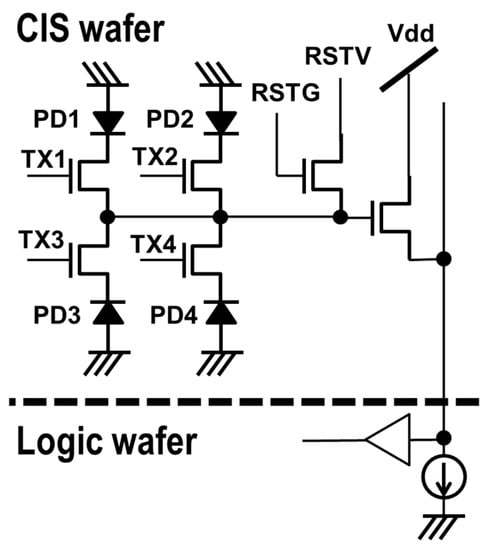 Taking into account the overall pixel performance, all pixel devices were placed on a CIS wafer, as shown in Figure 3. Since pixel devices were kept on a CIS wafer, advanced 45 nm technology was desired in terms of its low noise and high fill factor. The pixel architecture adopted a 2 × 2 shared 4-transistor without row-select, and the pixel unit cell size was 0.90 μm.