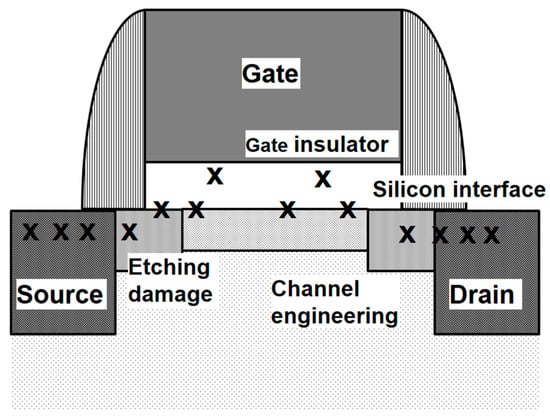 Traps influencing the source follower noise exist in the gate insulator, at the silicon interface, and in bulk, as shown in Figure 4. Thanks to the dedicated CIS wafer process, related processes, for instance, minimizing etching damage, eliminating dangling bonds, and device channel engineering, have been fully optimized [].