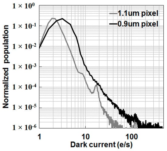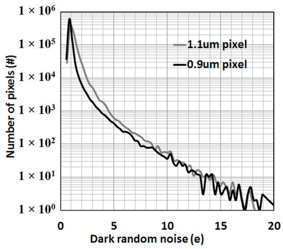 A histogram of the individual pixel dark current at 60 °C is shown in Figure 11. The dark current peak at 60 °C corresponds to 3.2 e−/s for the 0.9 μm pixel, and the dark current distribution of the 0.9 μm pixel is close to that of the 1.1 μm pixel in spite of the higher photodiode dose.
