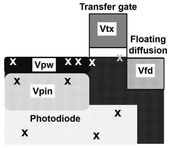 It is well known that defect located at the transfer gate edge is a main source of dark current and white pixels (Figure 7) []. Concerning defect density reduction, key process conditions such as ion implantation and annealing steps were carefully optimized to minimize every kind of defect and to recover damages.