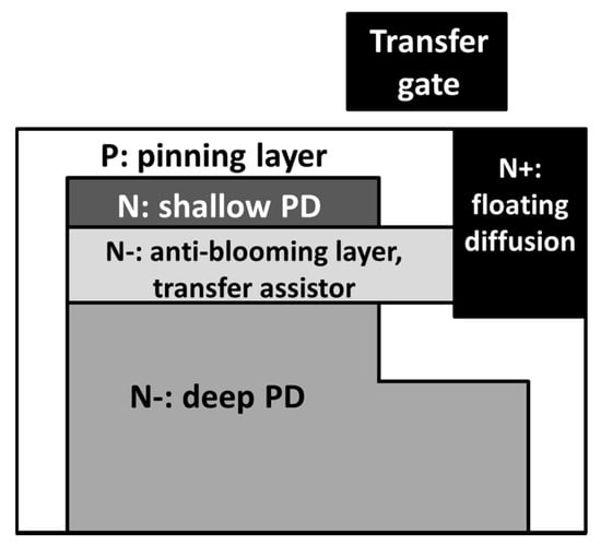 An additional N-type layer was interposed between a shallow photodiode (PD) and a deep photodiode, which also extended to the floating diffusion region (Figure 8). The floating diffusion node bias can be decreased by increasing the additional N-type layer dosage, and anti-blooming performance is not affected.