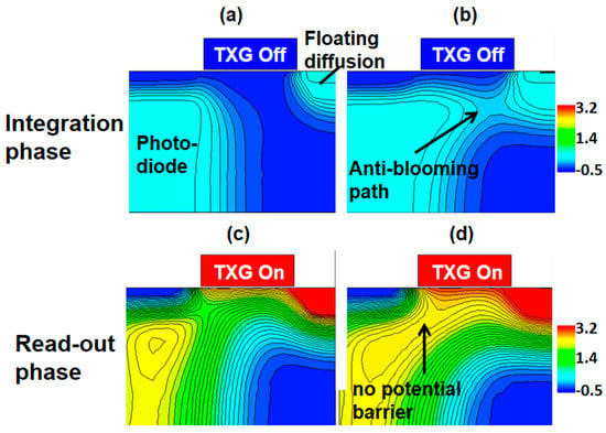 As shown in Figure 10, it is evident from the three-dimensional technology computer aided design (TCAD) device simulation results that an anti-blooming path was clearly made, and charge transfer capability improved as well.