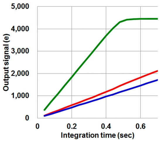 Figure 12 shows a light response curve of 0.9 μm pixels. The green color is the green channel, and red is the red channel, and blue is the blue channel. As the TCAD device simulation results show, even after the green channel signal saturated, the adjacent channels, the red and blue signals, were not distorted. From this fact we can conclude that blooming was 0.5% []. This data also shows a measured linear FWC of 4100 e−.