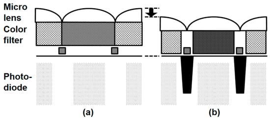 - Kitamura, Y.; Aikawa, H.; Kakehi, K.; Yousyou, T.; Eda, K.; Minami, T.; Uya, S.; Takegawa, Y.; Yamashita, H.; Kohyama, Y.; et al. Suppression of Crosstalk by Using Backside Deep Trench Isolation for 1.12 μm Backside Illuminated CMOS Image Sensor. In Proceedings of the IEEE International Electron Devices Meeting, San Francisco, CA, USA, 10–13 December 2012. [Google Scholar]