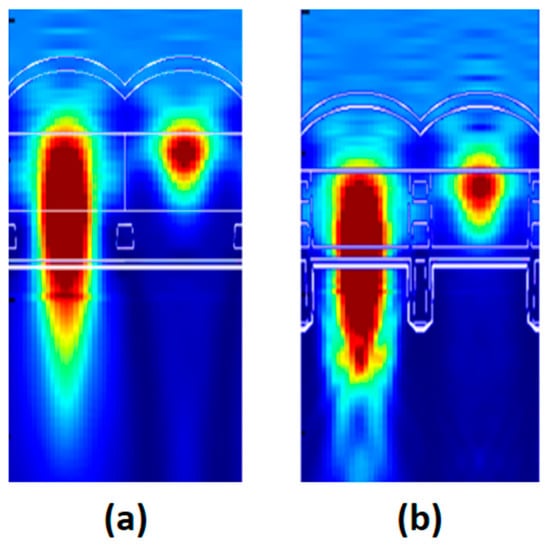 Optical simulation results at an incident wavelength of 530 nm. (a) Control pixel; (b) crosstalk-improved pixel.