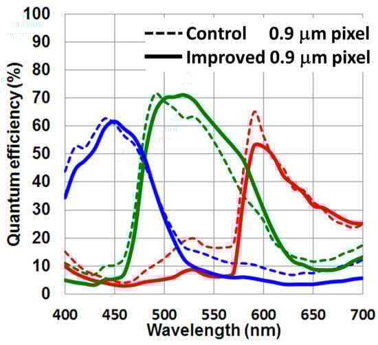 Taking into account the optical simulation study results, we made a silicon sample. Obtained quantum efficiency (QE) spectra of the 0.9 μm pixels are shown in Figure 15. Optical crosstalk was greatly suppressed, and the blue and red responses slightly decreased due to a slightly smaller aperture area of the grid structure. Improving the green channel’s quantum efficiency is realized by a newly developed color filter material.