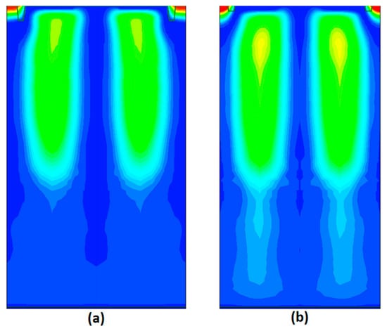 Three-dimensional TCAD simulations of photodiode showing electrostatic potential contours. (a) Two 0.9 μm pixels; (b) two 0.8 μm pixels.