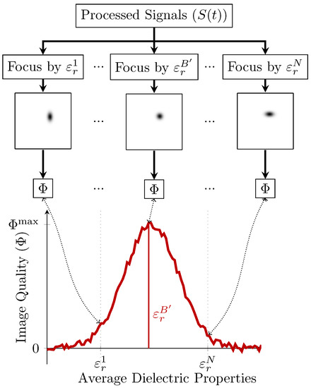 - A set of backscattered signals, , is beamformed into the set of images, using a range of assumed average dielectric properties ;