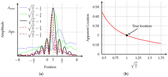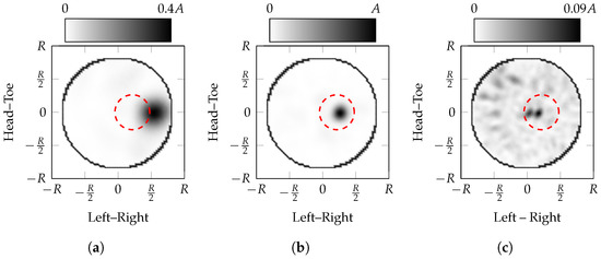 - if the effective average dielectric properties are underestimated (i.e., ), the apparent location of the scatterer moves towards the edge of the imaging domain (closer to R). This localisation error is due to reflections appearing to come from closer than their true origin and the channels closest to the scatterer are dominant in the coherent summation;