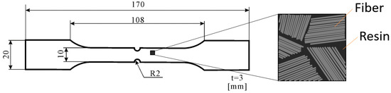 Configurations of the CFRP specimen employed in this study are shown in Figure 2. The specimens were cut from laminated short fiber CFRP sheet with vinyl ester resin and 25.4 mm long carbon fiber bundles. Each bundle was composed of 12,000 short carbon fibers. The mass content (wt %) of resin and fiber was 67 and 33, respectively. The specimen has circular notches with a radius of 2 mm.