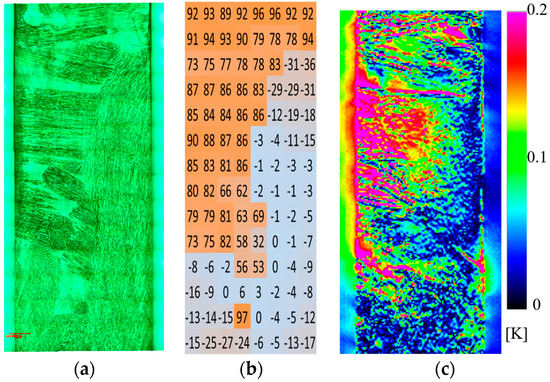 Fiber orientation angles and thermoelastic temperature change (σmax = 100 MPa, f = 7 Hz): (a) optical image; (b) orientation angle; (c) thermoelastic temperature change.