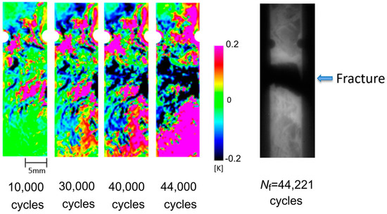 Fatigue test was conducted for the short carbon fiber reinforced plastic specimen with circular notches under the applied maximum stress σmax = 180 MPa. As described in the introduction, Uenoya et al. [25] developed the thermoelastic damage analysis (TDA) for the early damage detection in plain-woven long carbon fiber reinforced plastics. In this technique, a differential thermoelastic temperature distribution image was generated by subtracting an image of thermoelastic temperature change obtained at certain loading cycle from a reference initial image of thermoelastic temperature change. Fatigue damage evolution causes local stress change, and this is emphasized in the differential thermoelastic temperature distribution image. Therefore, the fatigue damage in CFRP sample can be detected in the differential thermoelastic temperature distribution image at the early stage in the fatigue life. In this study, the reference initial image of thermoelastic temperature change was set at 200 cycles. The obtained TDA images at 10,000; 30,000; 40,000; and 44,000 cycles are shown in Figure 7, with the infrared image obtained after failure of the CFRP specimen at 44,221 cycles. It is found from TDA images that the thermoelastic temperature change ∆TE on the fracture part was decreasing with the increasing loading cycles. And the decreasing area of ∆TE was expanded in the transverse direction of the specimen. This indicates that fatigue damage can be detected from the local stress change caused by the change in load sharing conditions due to the damage evolution.