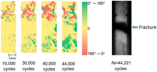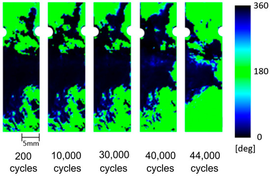 Distribution of the phase difference ∆θE obtained at 200; 10,000; 30,000; 40,000; and 44,000 cycles are shown in Figure 8. Change in phase values were found in the region where the structural fracture of CFRP sample was detected. The phase values were changed from 0 to 180°, and the phase change region was expanded with the increasing loading cycles. As described in the foregoing paragraph, ∆θE = 0° means that the thermoelastic effect of carbon fiber bundles is predominant, on the other hand ∆θE = 180° means that the thermoelastic effect of matrix resin is predominant. The change in phase values indicates the change of load sharing conditions between resin and carbon fiber bundles due to the fatigue damage evolution. We thought that high-sensitivity early fatigue damage detection technique can be developed by utilizing the change in phase difference ∆θE; we propose a thermoelastic phase damage analysis (TPDA). In TPDA a differential phase delay distribution image is generated by subtracting a phase delay image obtained at certain loading cycle from a reference initial phase image. In this study the reference initial phase delay image was set at 200 cycles. The obtained TPDA images at 10,000; 30,000; 40,000; and 44,000 cycles are shown in Figure 9. It was found from TPDA images that the significant change of phase values from 0 to 180° (indicated green color in the figures) was found in the region where the structural fracture was detected.
