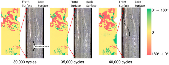 In this experiment, visible images on the side surfaces of the CFRP specimen were taken by digital microscope. Microscopic visible images taken at 30,000; 35,000; and 40,000 loading cycles are shown in Figure 10 compared with TPDA results. The microscopic imaging area was indicated by red broken lines in the figures. It was found that delamination damage was initiated at 30,000 cycles and it grew and reached the front surface of the specimen (infrared observation side). TPDA images show the change in phase values was clearly detected in the region where the delamination fracture was initiated. The phase values were changed from 0 to 180°, and the phase change region was expanded with the increasing loading cycles. As described in the foregoing paragraph, ∆θE = 0° means that the thermoelastic effect of carbon fiber bundles is predominant, on the other hand ∆θE = 180° means that the thermoelastic effect of matrix resin is predominant. The change in phase values indicates the change of load sharing conditions between resin and carbon fiber bundles due to the evolution of delamination damage.